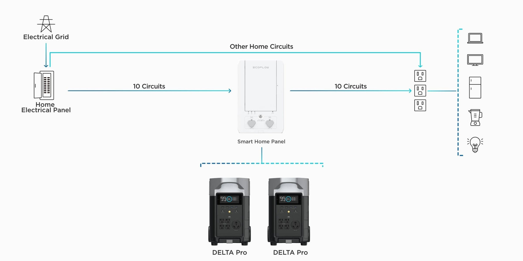 El panel inteligente EcoFlow Smart Home integra tus unidades EcoFlow DELTA Pro con tu hogar para permitirte disfrutar de una solución de baterías domésticas versátil y ampliable con la que podrás almacenar energía para consumirla posteriormente. Conecta hasta 10 de tus circuitos domésticos para disfrutar de una alimentación ininterrumpida durante los apagones, una gestión inteligente de la energía y mucho más. Y todo ello mientras ahorras dinero.